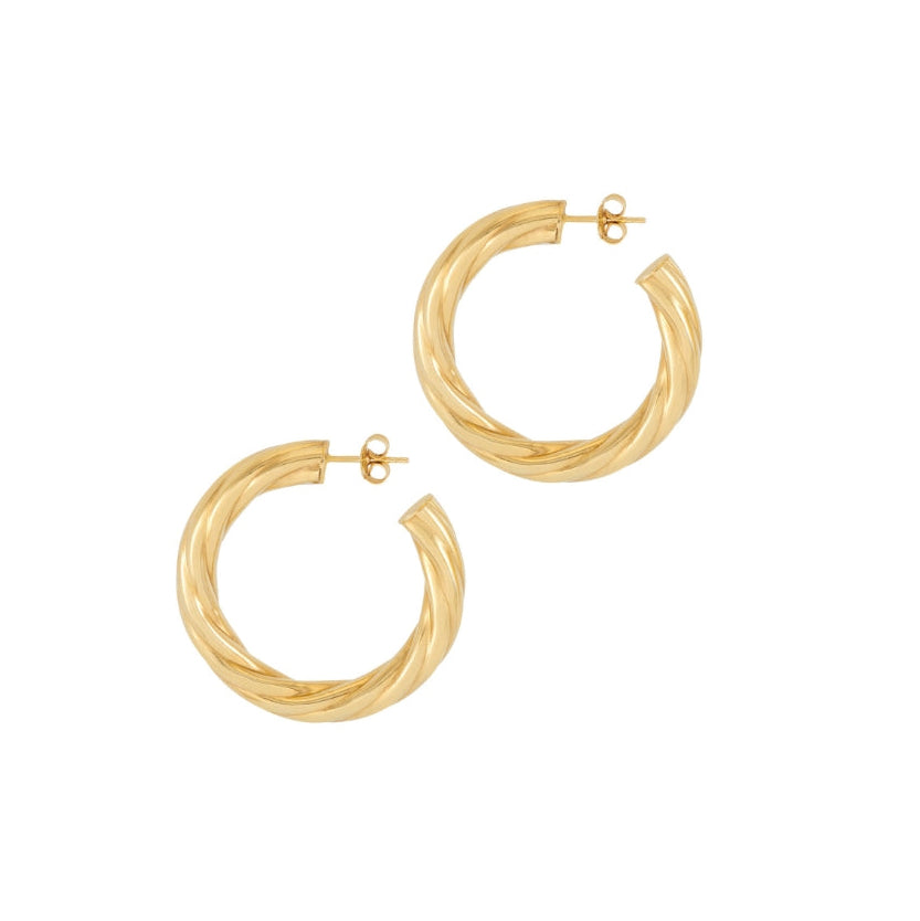 Luxury twist hoop earrings. We've taken the classic gold hoop and given it a dramatic twist. Gorgeous earrings for the shoulder pad season. Light to wear, instant statements without weighing you down.
